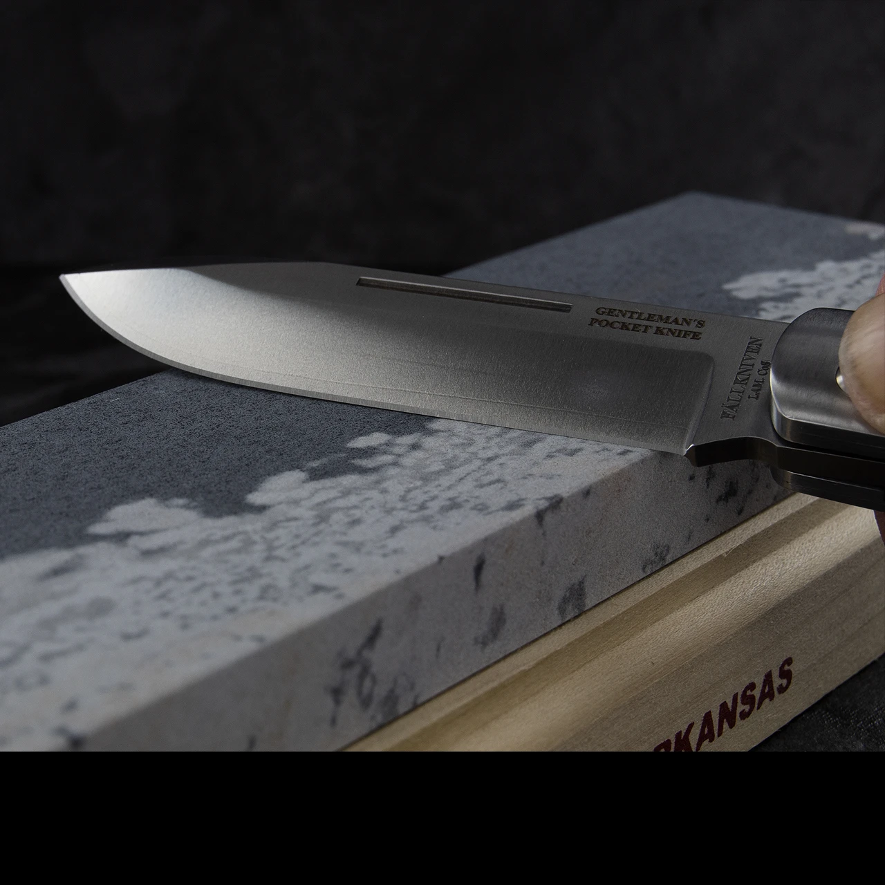 The Arkansas Whetstone Soft is mounted on a cedar wood block and works in the same way as a bench stone. It lies flat on a flat surface and can be sused with oil or water to give a fine degree of edge. Moisten the stone and gently move the knife blade in circular motions. Great for finishing off an edge and works very well on a Scandi grind.