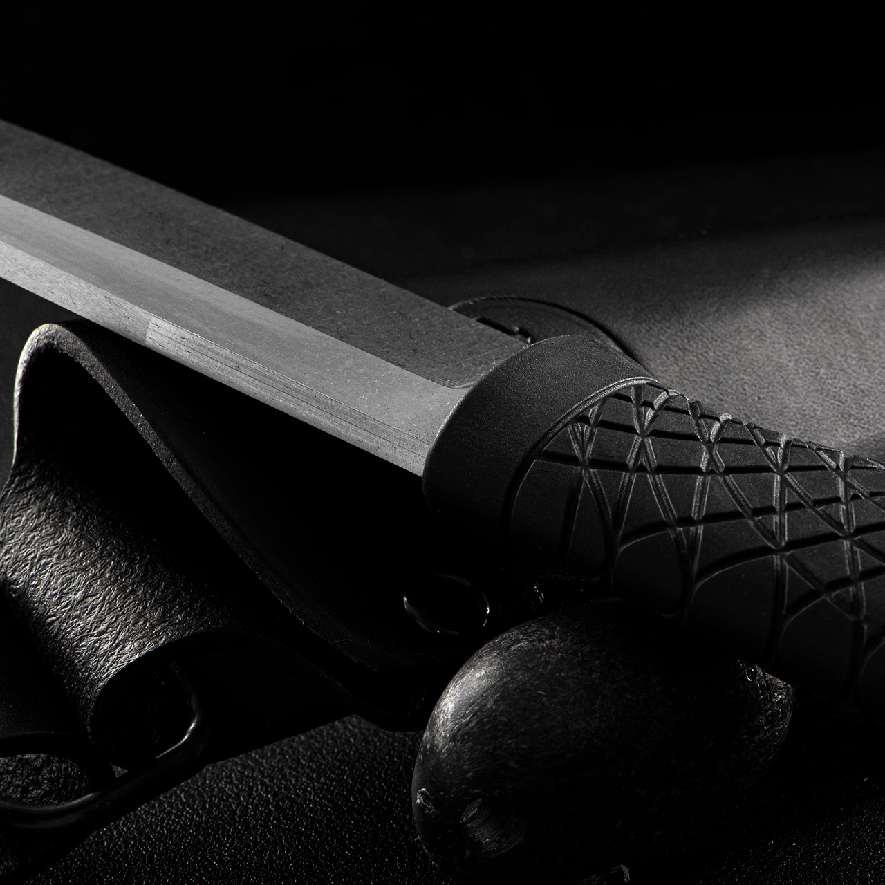 With the Boker Bronco these ambitious requirements were met in the following way: The CPM-3V was developed by Crucible Industries LLC – the specialist and worldwide market leader in powder metallurgical steels – to provide unprecedented shock-load tolerance, breakage elasticity and splinter resistance with a phenomenal edge retention and hardness of 62-63 HRC. These properties of the powder-metallurgical carbon steel were achieved, among other things, by a precisely adjusted chromium content of 7.5%. In this way, the positive properties of the alloying element Cr, such as the increase in wear resistance and hardenability, could be utilised while maintaining a fine microstructure. The universal wide drop-point blade with a high-set saber grind has always been the hunter’s preferred shape for both big and small game and is also suitable for both fine tasks such as stick feathering and for the more coarse, such as the obligatory batoning. The tang is continuous and protrudes a few millimetres from the end of the handle. This ensures maximum stability and the tang can also withstand powerful blows with a log or other object. A short part of the back of the blade forms sharp 90° edges on both sides for striking sparks from the included firestarter.