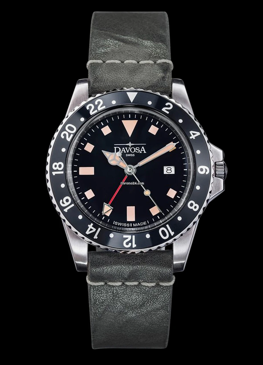 The Davosa Vintage Diver Quartz is a stylish everyday watch for all retro style lovers and, with its diameter of 39 mm, perfect for every wrist. The Swiss quality movement Ronda 505/24h also allows the display of a second time zone which is highlighted by a red hand.