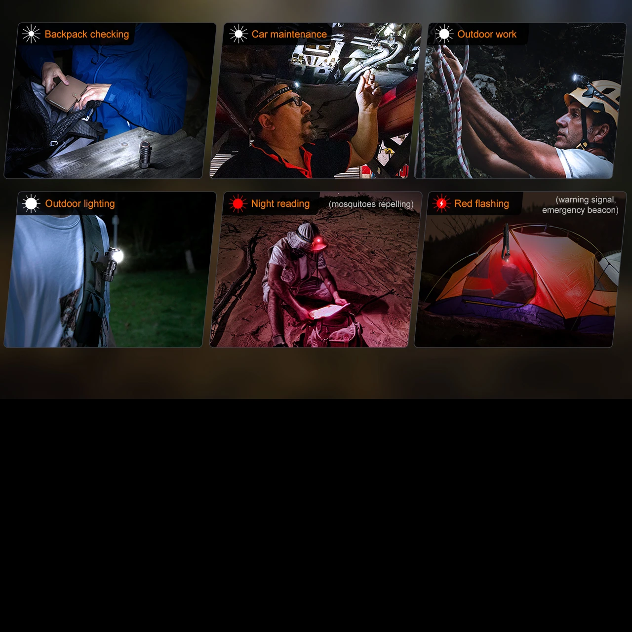 - Red SOS: 5 lumens (120 hrs) – 6m beam (light visible at considerable distance)
