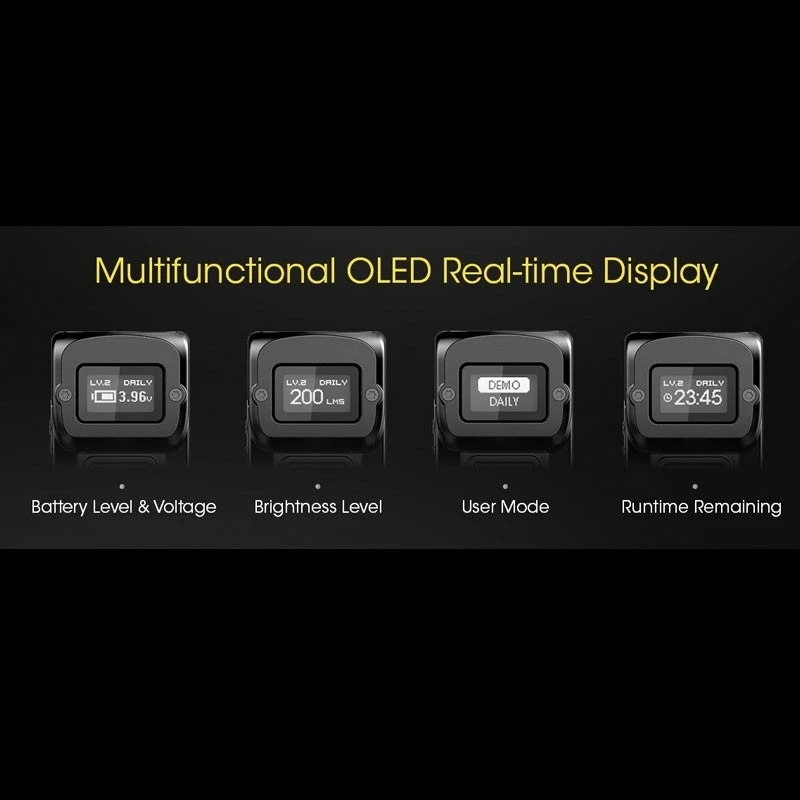 The keyring light offers five brightness levels, ranging from 1 to 1000 lumens, all of which are operated by a dual side switch interface. The TUP features a multi-functional OLED display which provides real-time information on the battery level and voltage, brightness level, user mode and remaining runtime.